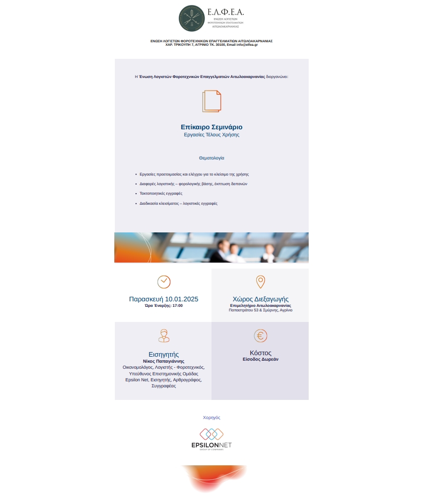 Hμερίδα με θέμα: “Εργασίες τέλους χρήσης”, θα πραγματοποιηθεί στις 10 Ιανουαρίου 2025, ημέρα Παρασκευή και ώρα 05:00 μμ. στην αίθουσα του Επιμελητηρίου Αιτωλοακαρνανίας στο Αγρίνιο.