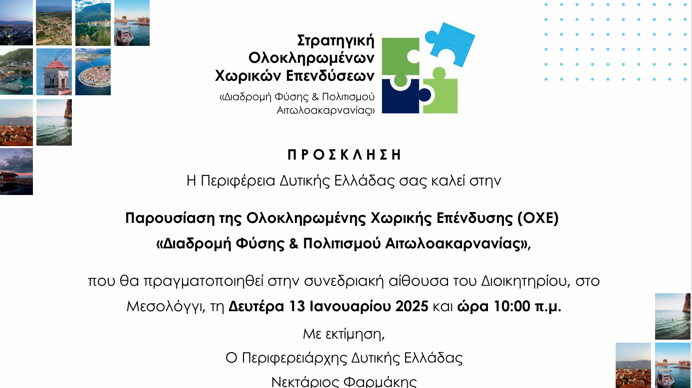 Η Περιφέρεια Δυτικής Ελλάδας πραγματοποιεί τη Δευτέρα 13 Ιανουαρίου 2025 εκδήλωση για την επίσημη παρουσίαση της Ολοκληρωμένης Χωρικής Επένδυσης (ΟΧΕ) – «Διαδρομή Φύσης & Πολιτισμού Αιτωλοακαρνανίας», στη συνεδριακή αίθουσα του Διοικητηρίου στο Μεσολόγγι (Κύπρου 30, Μεσολόγγι), με ώρα έναρξης στις 10 το πρωί.