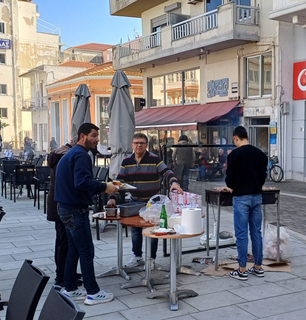 Στις γειτονιές και τις πλατείες, επιχειρηματίες και παρέες έστησαν αυτοσχέδιες ψησταριές, προσφέροντας σουβλάκια και μεζέδες στους περαστικούς.