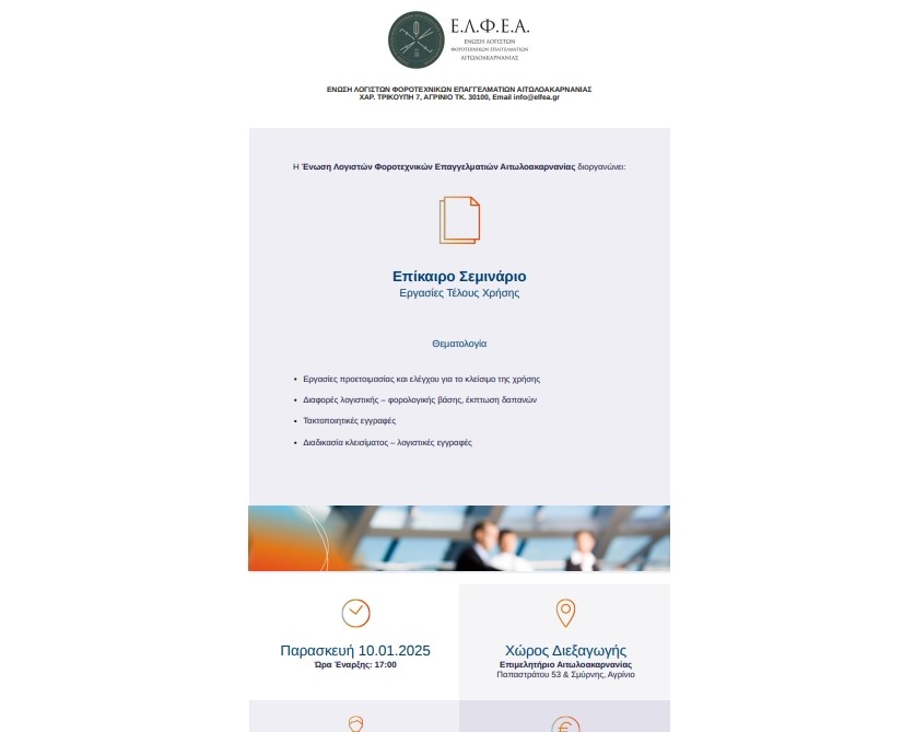 Hμερίδα με θέμα: “Εργασίες τέλους χρήσης”, θα πραγματοποιηθεί στις 10 Ιανουαρίου 2025, ημέρα Παρασκευή και ώρα 05:00 μμ. στην αίθουσα του Επιμελητηρίου Αιτωλοακαρνανίας στο Αγρίνιο. Η ημερίδα διοργανώνεται από την Ένωση Λογιστών Φοροτεχνικών Επαγγελματιών Αιτωλοακαρνανίας με ελεύθερη είσοδο. Εισηγητής θα είναι ο Νίκος Παπαγιάννης, Οικονομολόγος, Λογιστής – Φοροτεχνικός, Υπεύθυνος Επιστημονικής Ομάδας Epsilon Net, Εισηγητής, Αρθρογράφος, […]